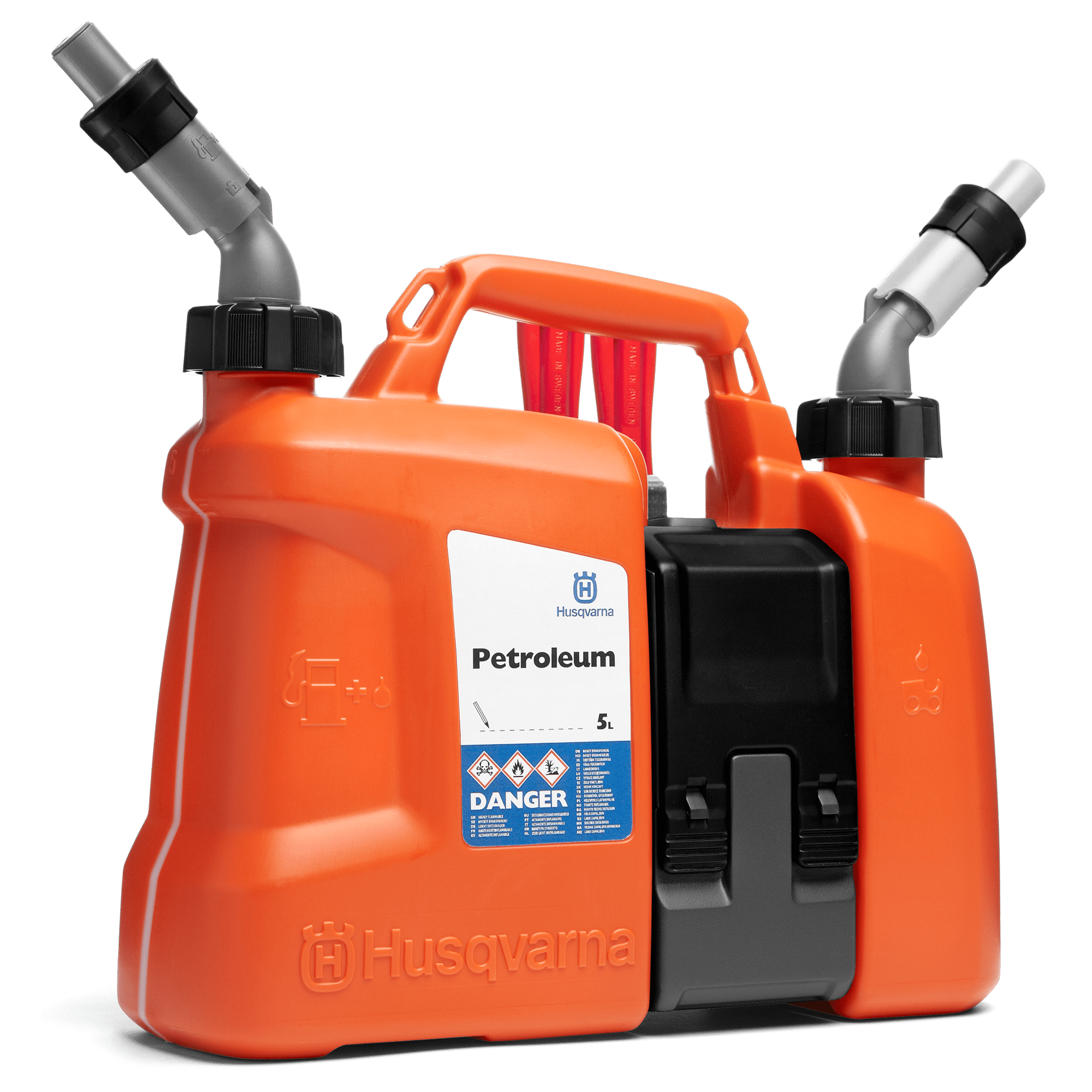 Denna kombidunk ger dig möjlighet att tanka snabbt utan stänk eller spill. Dunken är försedd med en verktygsväska med plats för vanliga verktyg och reservkedjor, fällkilar eller liknande. Volymförhållandet mellan bränsle och kedjeolja har optimerats så dunken rymmer 5 Liter bränsle och 2,5 Liter kedjeolja. Godkänd enligt UN rekommendationer.
